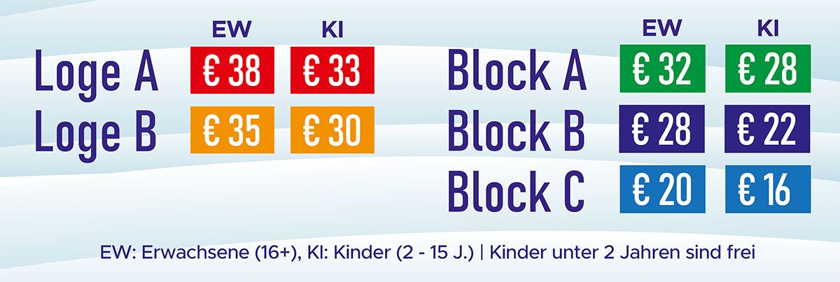 Jeden Samstag um 19:00 Uhr erhalten Sie zu jeder gekauften Karte für Erwachsene eine Karte der gleichen Kategorie GRATIS dazu.